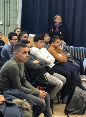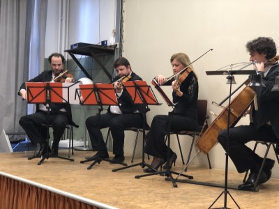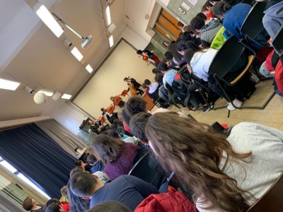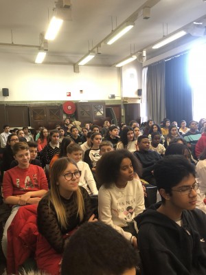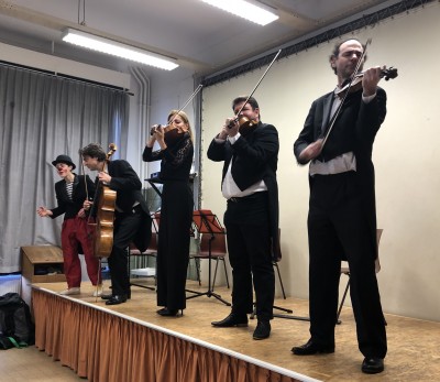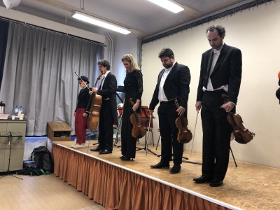 A l’initiative de la Fédération des Jeunesses Musicales de Bruxelles, fidèle à sa mission d’initier les enfants et les jeunes à toutes les musiques, des musiciens de l’Orchestre Royal de Chambre de Wallonie ont joué dans notre école pour les élèves de 1re année !