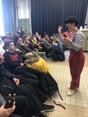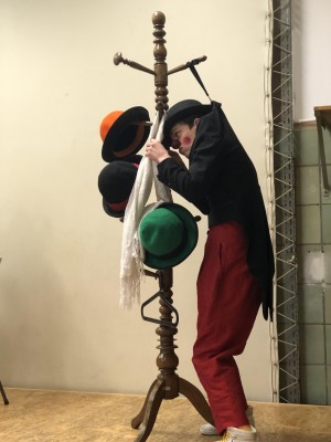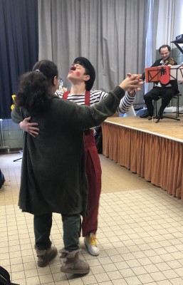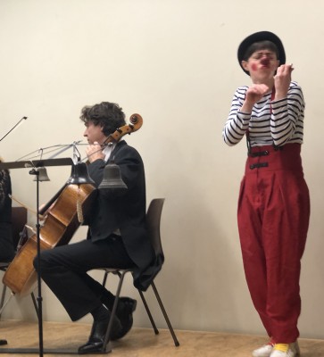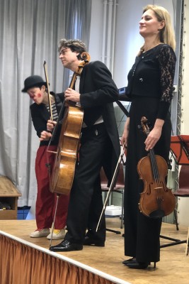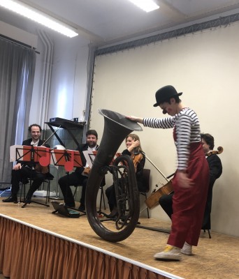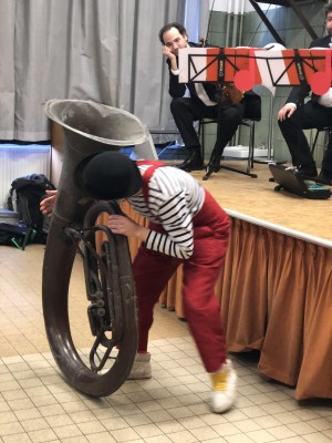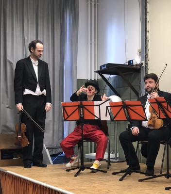 Pendant le concert où se succèdent aussi bien du « Carmen » que du Piazzolla, des « petites musiques de nuit » que de la marche turque, le quatuor se voit chercher des crosses par une petite farceuse au regard intrépide. Nez rouge, chapeau melon et salopette d’acrobate : ce clown sans nom s’incruste chez Bartók, Haydn et Strauss en déballant ses « instruments surprises » (cuillère à café, ukulélé, klaxon, tuyau,…), pour le plus grand bonheur des petits et des grands.