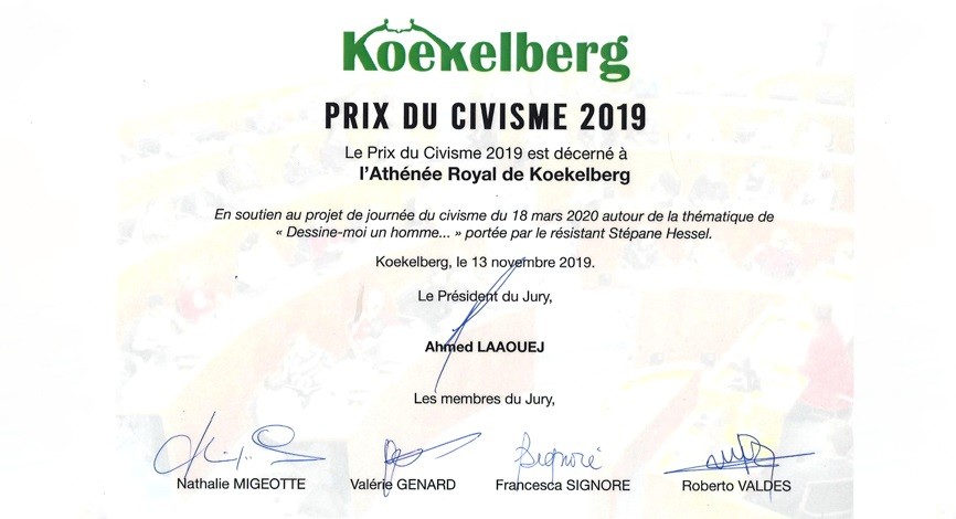 Mercredi 13 novembre 2019, après la projection du film Papicha de Mounia MEDDOUR au cinéma des Galeries, M. Ahmed LAAOUEJ, Bourgmestre, a remis à notre Athénée le prix du civisme 2019 de la commune de Koekelberg, en soutien au projet de notre journée de la citoyenneté du 18 mars 2020 autour du thème "Dessine-moi un homme" portée par le résistant Stépahen Hessel.